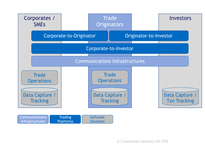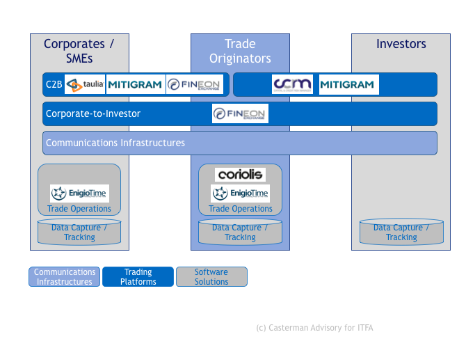 Trade finance is a wide and complex eco-system. One must identify the very segment or function that each particular innovation is targeting. To assist that task, we created a chart to map the various finechs onto the eco-system [see below]. ITFA has gathered close to 20 fintechs focusing on data and trade finance innovations. Most of them are highly specialised and some of them are working together (e.g., INTIX and Tradeteq on ML-based transaction-level credit scoring). Some of those fintechs are acting as software providers (e.g., INTIX, Traydstream) that banks can use independently of the technologies used by their counterparties whereas other fintechs operate community-centric trading platforms (e.g., Tradeteq, LiquidX, TradeAssets) so counterparties use a common technology platform to communicate and make deals. Most of the top transaction banks are now working with several of those fintechs (and other fintechs beyond ITFA). Banks have set-up multi-bank consortiums to re-invent some industry-level practices. Examples include Marco Polo (based on R3 and TradeIX) as well as TFD Initiative (based on Tradeteq). Whilst many of the initial consortiums were designed around blockchain, some are not, such as Trade Information Network (TIN) and TFD Initiative.